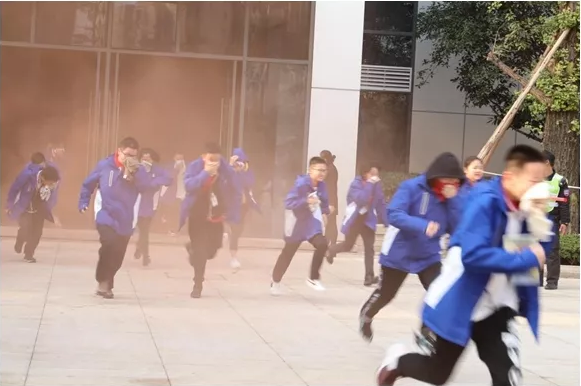 宿舍“着火”了,怎么办?——伴随着警报声响起,同学们用湿毛巾捂住口鼻,迅速而有序的从防火通道口撤离“火灾”现场。