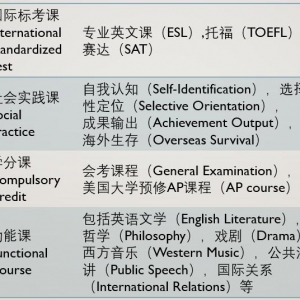 国际标考课 International Standardized Test 专业英文课(ESL),托福(TOEFL),赛达(SAT) 社会实践课 Social Practice 自我认知(Self-Identification),选择性定位(Selective Orientation),成果输出