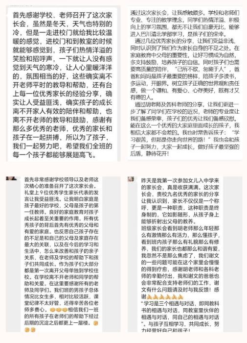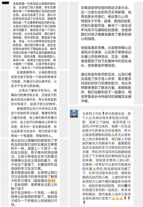 这是上周末清北学部小初学段家长会后依宸爸爸的参会感受,他不远千里来到巴川给孩子开家长会,给老师们留下了深刻的印象。像他这样从外地赶回来的家长也不在少数,为了让家长们来得值、有收获,学校之前也想了很多办法。