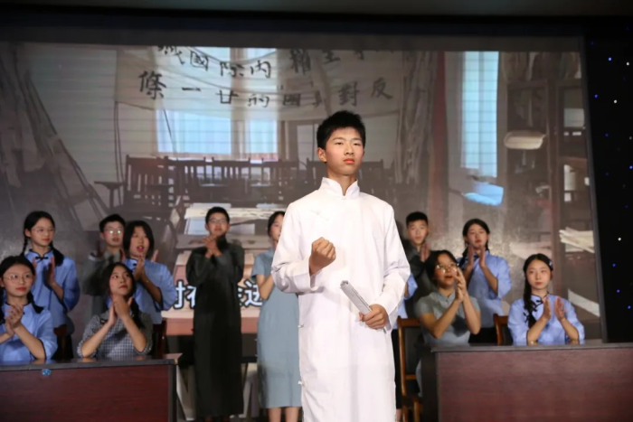 "为中华之崛起而读书!"当5班少年铿锵有力的誓言响彻剧场,历时30天的排演故事也随之展开。从最初彩排时《抵制日货,身陷囹圄》剧目的张力不足,到同学们连夜修改剧本;从主演韩濠骏因剧本变动而频频忘词的焦虑,到大家利用课余时间加紧排练的坚持——这场青春致敬的每一个细节都令人动容。